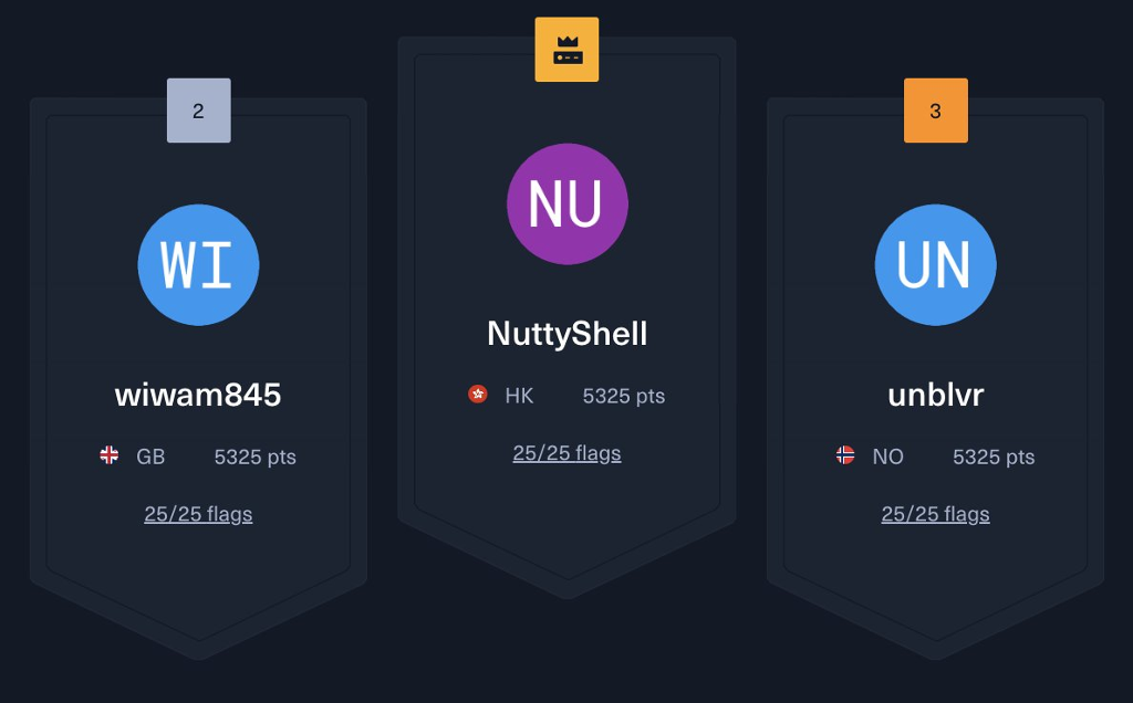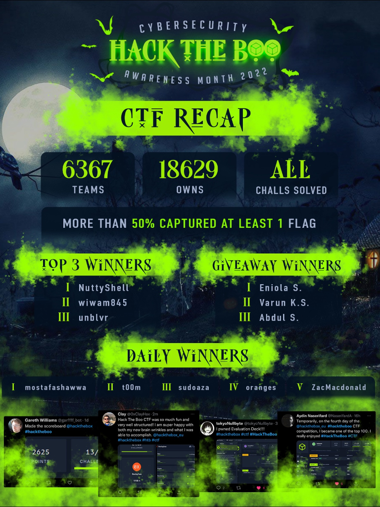 The halloween-themed CTF was held on 22 Oct 2022 to 27 Oct 2022 in HTB’s Cybersecurity Awareness Month 2022. NuttyShell obtained the 1st place among 6367 players.